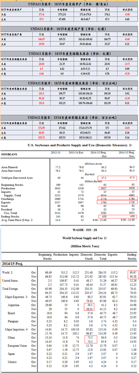14/15年度美國大豆單產為47.5蒲式耳/英畝,上升了0.4蒲式耳,主要得益于衣阿華和南達科州的貢獻。美國大豆的產量比10月份上升了1%。美國大豆供應美國大豆出口增加了20百萬蒲式耳到1720百萬蒲,反映出美國創(chuàng)紀錄的出口節(jié)奏。美國大豆壓榨增加了10百萬蒲到1780百萬蒲主要是由于增加的出口需求。國內豆粕需求較之13/14年度需求輕微減少。大豆期末庫存沒有變化。14/15年度的農場價格范圍沒有發(fā)生變動,仍然在9-11美元/蒲式耳。